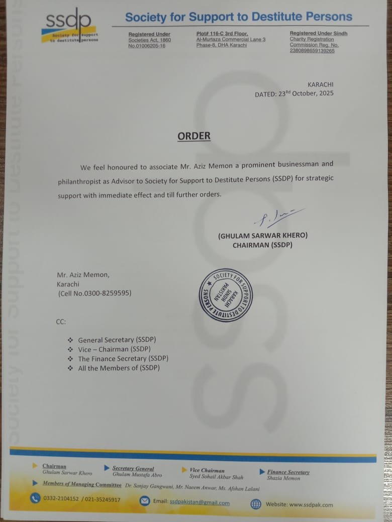 Mr Aziz Memon, Chairman King group of companies is a prominent business man and philanthropist, has reposed his trust in Society for Support of Destitute Persons and has agreed to join as its advisor. The SSDP welcomes his with pride & hope that will guidebSSDP to teach it s’ desired goals of Services to humanity.